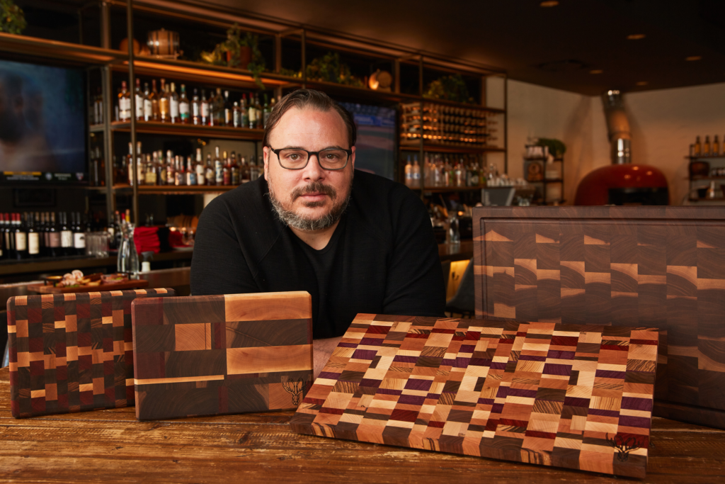 The first cutting boards he made were for The Hutch, while he was still chef-partner. “I use face grain for charcuterie boards, and side and end grains for cutting boards,” he said. “Each design is unique, or the woods are unique for each customer. I don’t want to pump out the same things. I’ll use six to eight different species for a chaos board; I love them. I’m a chef, and I know how much chefs love tools that are unique to them, so I try to design and build accordingly.”