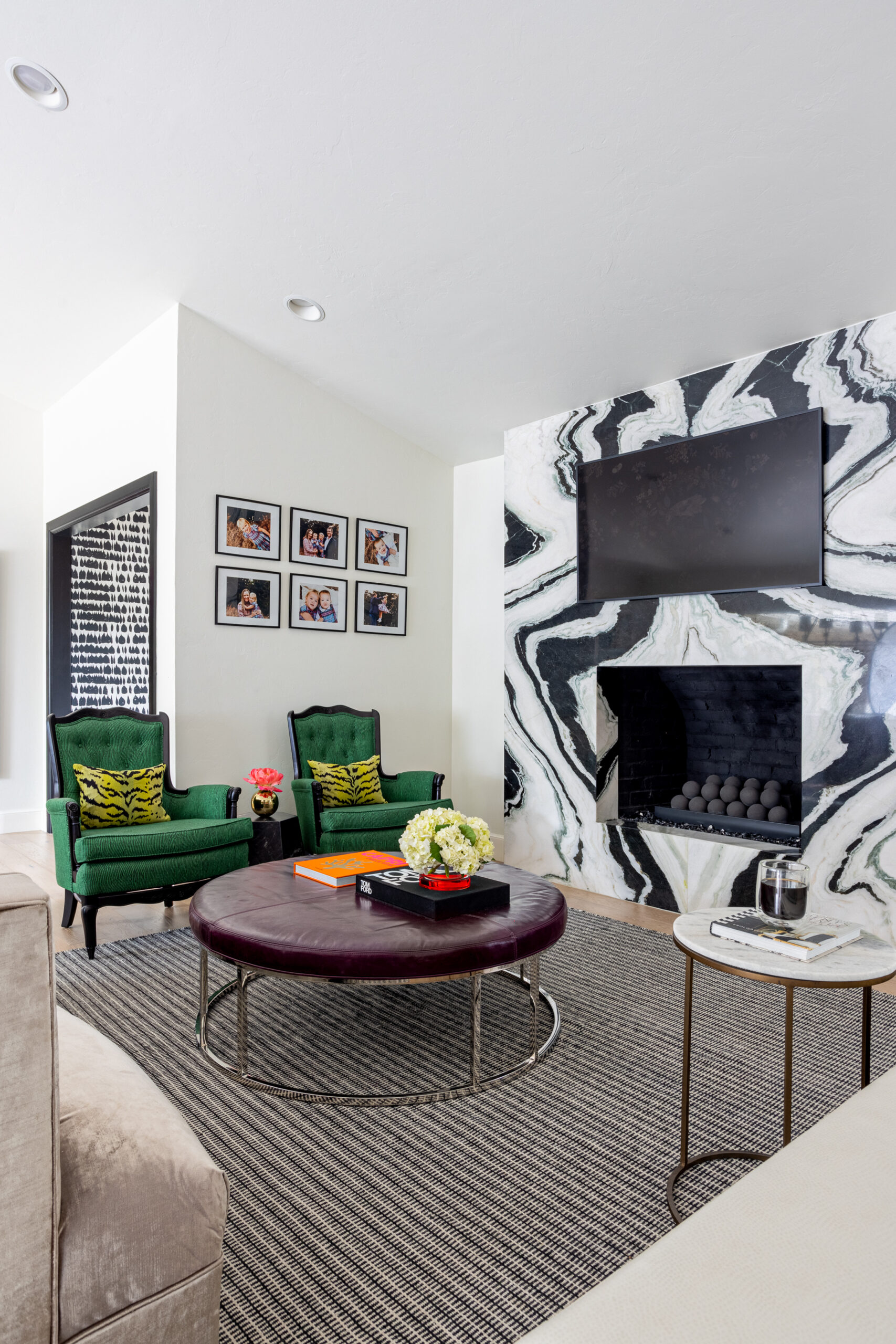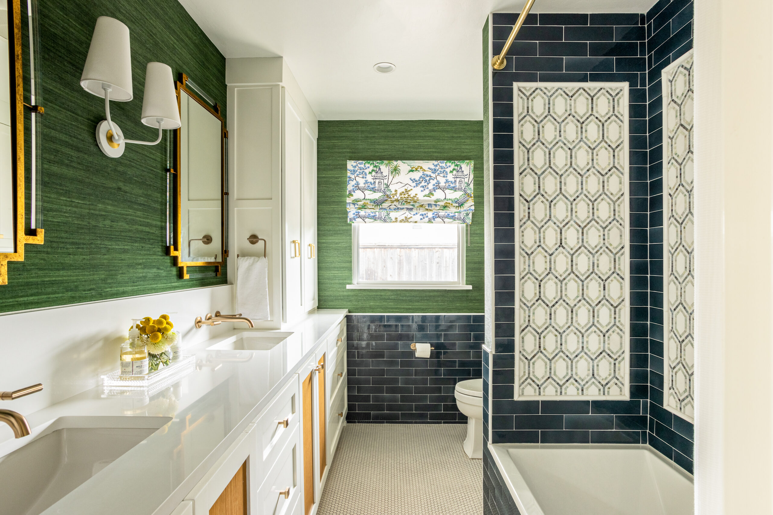 Bold designs include the entry, which features Schumacher Queen of Spain wallpaper, black trim and white-and-gray marble tile. The hall bathroom is punctuated by an emerald green grasscloth (in a kid-friendly, wipeable vinyl) and natural woods. And the home office — surrounded by stunning butterfly wallpaper — is both beautiful and practical.
