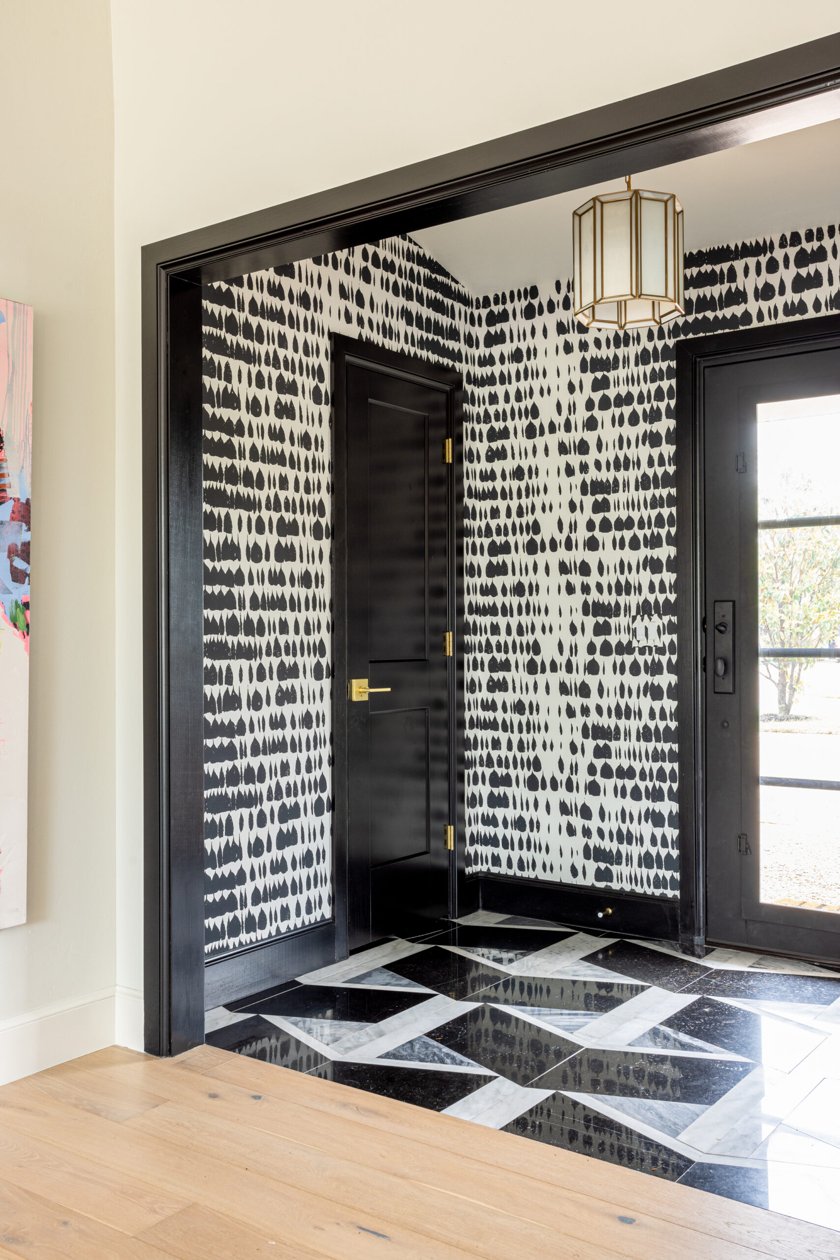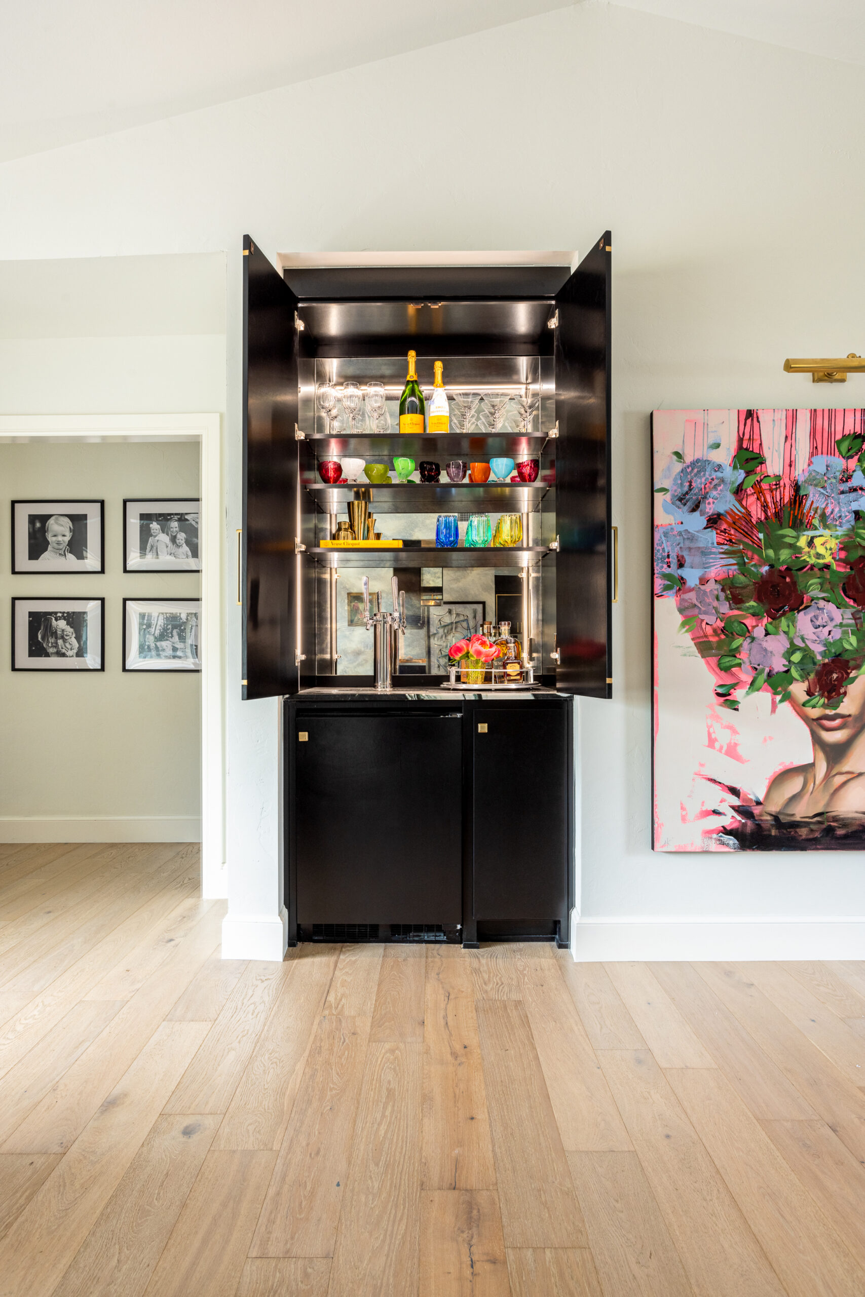 Sutter improved the layout while layering in elements she notes as “extra funky, bright or a bit loud.” Black and white themes flow throughout the home, while wallpapers, pillows and drapery provide color and interest. The Herritts’ unique art collection fits right in.