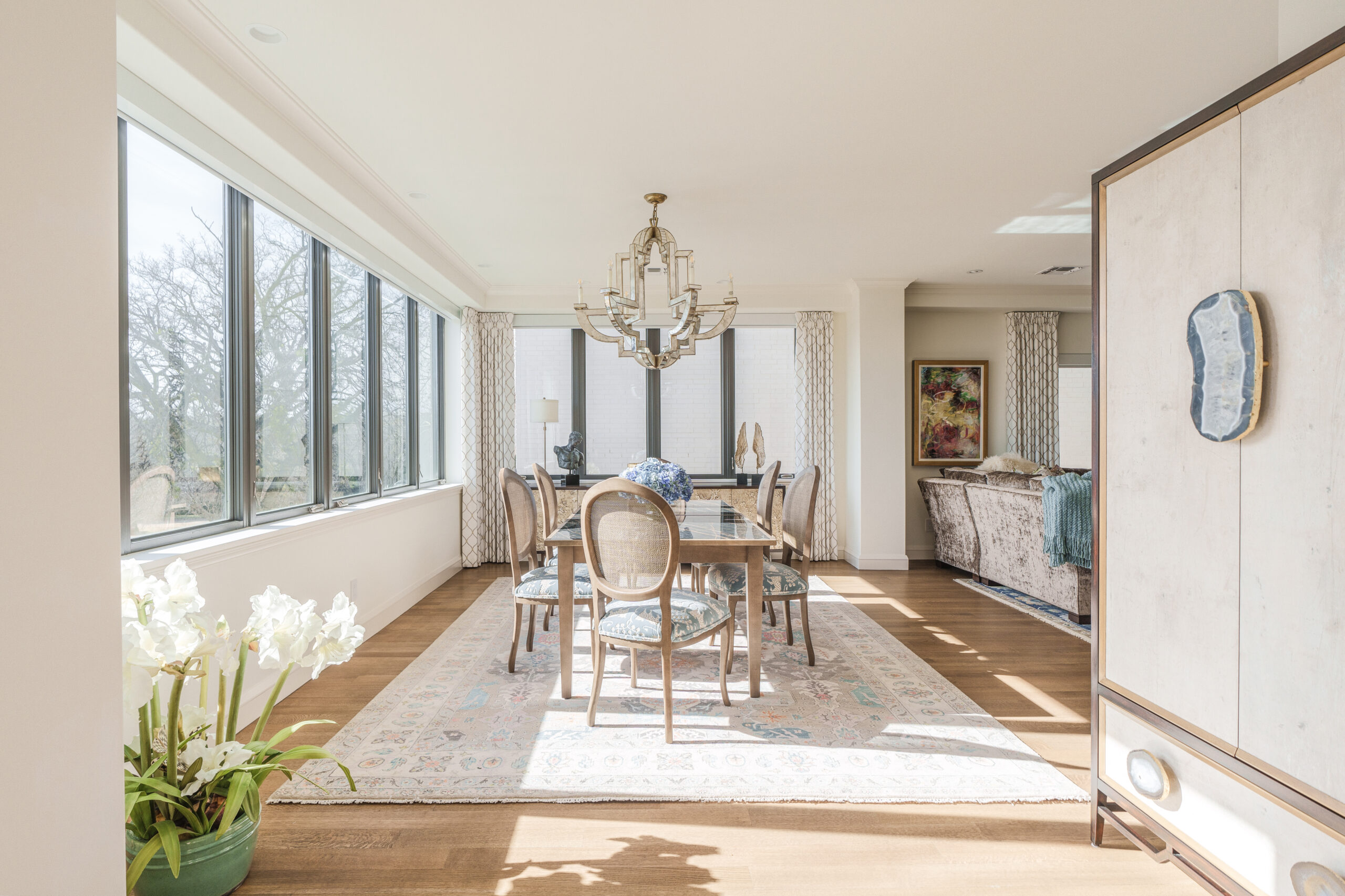 The condo features large windows in the kitchen, dining and living areas, so furniture was arranged to maximize the natural light, with taller pieces placed on interior walls. The Austins added a balcony to the layout, and they love having a personal outdoor space. Soft colors make the rooms feel inviting, while the Austins’ art collection adds color and character to the home.