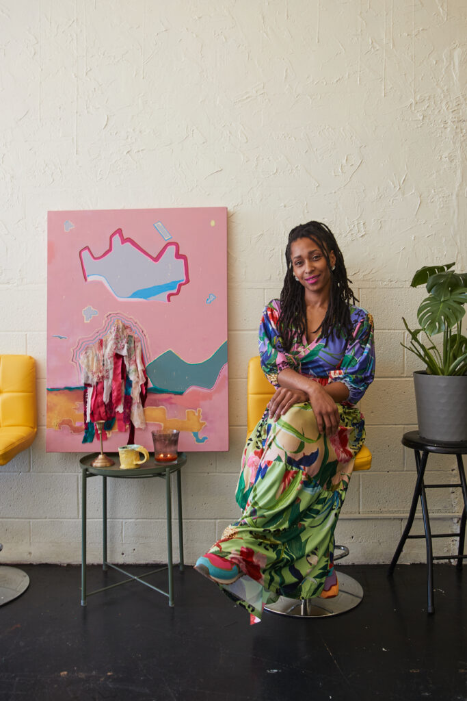 To pay bills, Burnett took a position in the tech industry, continuing to use art as therapy. “I used art to journal, to figure out my next steps. I used it to process. People would see my stuff and wanted it,” she said. Those same people would soon make monetary offers, and over time, Burnett developed a collector base. “I remember when I actually put ‘artist’ on my resume because I wanted to take a chance on myself.” Instagram paved the way to her first installation at the Liz Lidgett Gallery + Design in Des Moines, Iowa.