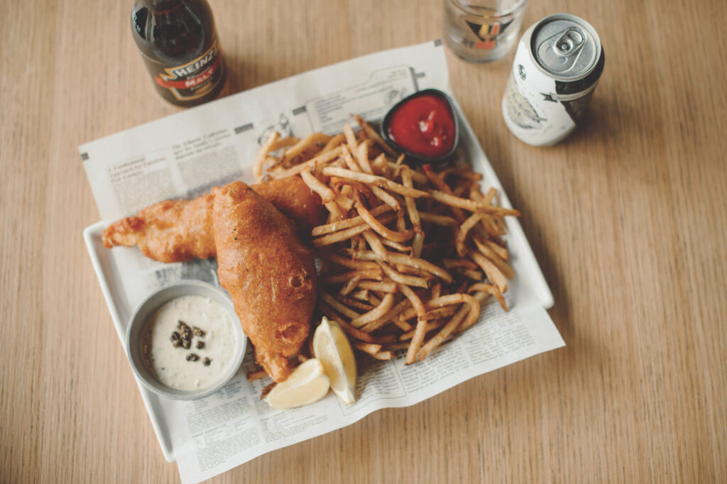 Done traditionally with breaded cod and served with fries, the fish is crispy outside, moist inside