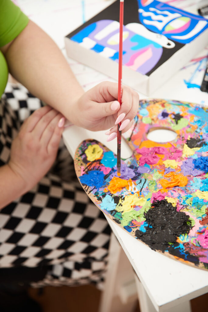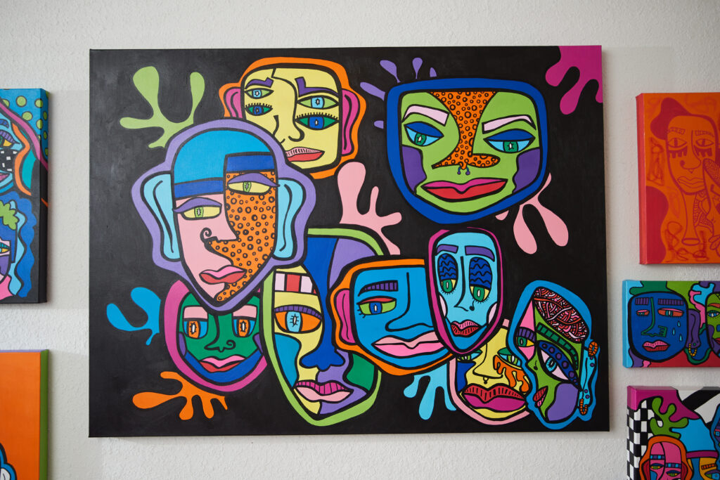 A: “My favorite piece is called “You’re All Invited.” I’m a really inclusive, optimistic person, so I think that title fits my personality — but I love the painting itself … During COVID, I propped up a giant canvas.. It was like 2 feet by 4 feet, and I took out Posca pens, which are my favorite drawing paint-pen tools, and I just made face after face after face that was unique. I ended up making over 300 faces on one painting … I just made them all different; not one face is like another.”