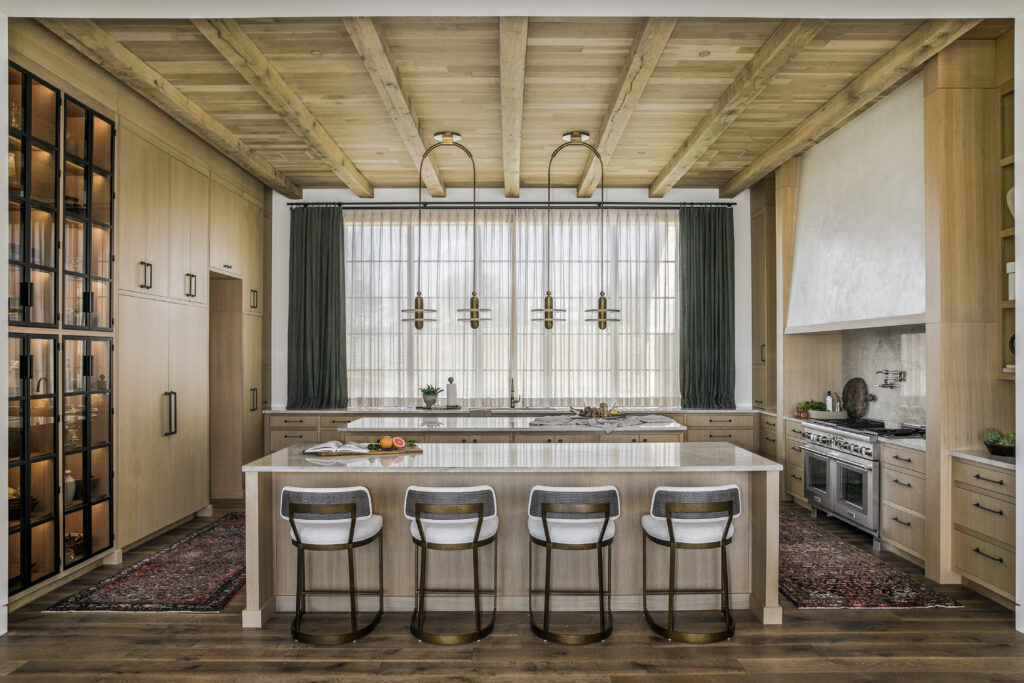 Outside, the two-tiered pool and fully equipped outdoor kitchen provide plenty of space for hosting and entertaining. Inside, luxurious, durable furniture and finishes in calming neutrals create a relaxed atmosphere. In the kitchen, a variety of textures adds visual interest. A Venetian plaster vent hood, alabaster and brass pendants, drapery and glass front metal cabinets all combine exquisitely. A powder bath goes bold with a dynamic black-and-white quartzite slab and tiger-print Gucci wallpaper; a whimsical surprise likely to delight guests. The Hollidays couldn’t be happier with their house; they love the layout, the design and most of all what it provides — the ability to host so many people and gather close to friends and family in this place that they call home.