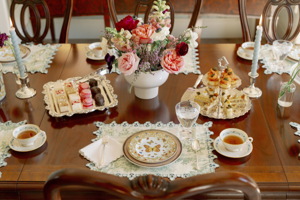 When springtime calls for tea time, a garden-inspired setting suits just fine. Interior designer Megan Pittman designed this dining room as well as the table setting, gracefully incorporating delectable bites from Perle Mesta and lovely floral stems from The Flower Truck.