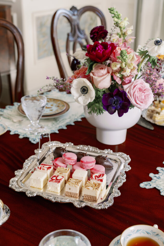 This table also brings the High Tea experience — offered at Perle Mesta restaurant — to a more intimate and residential setting. Perle Mesta Chef Andrew Black came to the house to personally prepare the salmon canapes and finger sandwiches. His famous egg salad sandwich is elevated with caviar, while the chicken salad sandwiches boast crispy fried chicken skins and fresh dill on top. Macaroons, chocolate mice and creamy cheesecake squares satisfy on a silver tray of sweets.