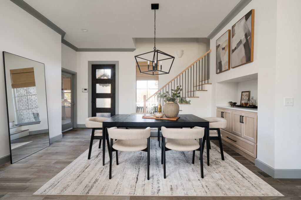 A new staircase was added onto the dining room, connecting the two floors. The dining room also received special attention during the remodel, with the addition of a custom-built buffet to accommodate the family’s existing dining table.