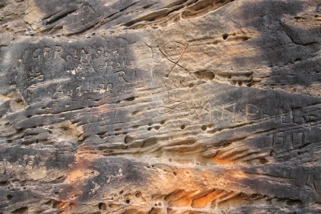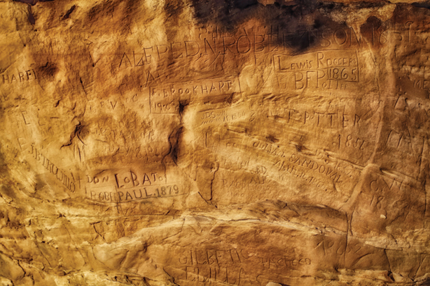 While resting and waiting, some travelers scratched their mark into the soft sandstone. In addition to names and initials, there are crosses, hearts, a five-pointed star, cattle brands, a double-pointed arrow, a reference to the American Expeditionary Force, Masonic and Odd Fellow emblems and an elaborate carving left unfinished. Some of the names belong to characters well known in their day. Most of the stories, however, are lost to time.
