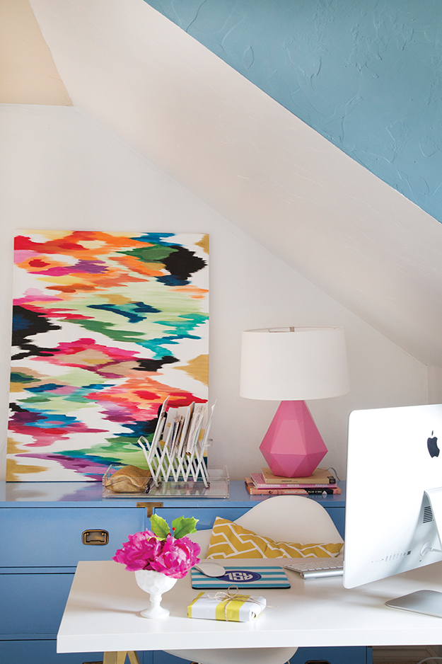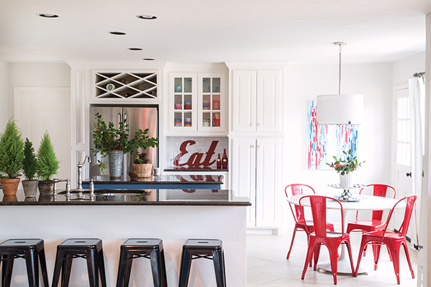 In keeping with the home’s fun but stylish feel, the red “Eat” sign – a purchase from Norman’s Antique Garden during Rachel’s college years – mirrors the playful hue of the candy apple Tolix chairs, and the nook near the back door houses a specially commissioned and designed painting by artist Erin Cooper, who also happens to be Rachel’s web designer.