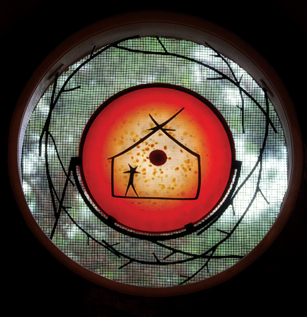 The chapel’s centerpiece is the orange-red stained glass window with the glyph of the man who was Noksowist/Oak-uh-hat-uh/Making Medicine/Oakerhater, representing the saint dancing in the lodge of the sun.