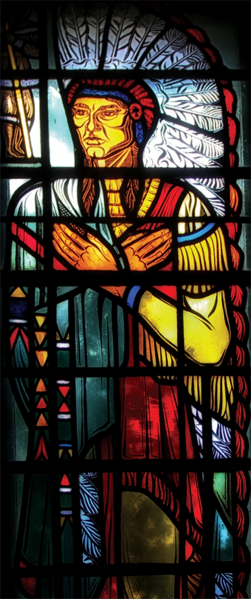 Benjamin Beames, a Choctaw athlete who played football for Central in 1942, was the model for the eight-foot-tall Indian Window inspired by John Oxenham’s song “In Christ There Is No East or West.” The work includes images representing the Latino, Native American, Asian and Eskimo cultures. Ray Gilliland, of Delaware Indian descent, created and executed the design.