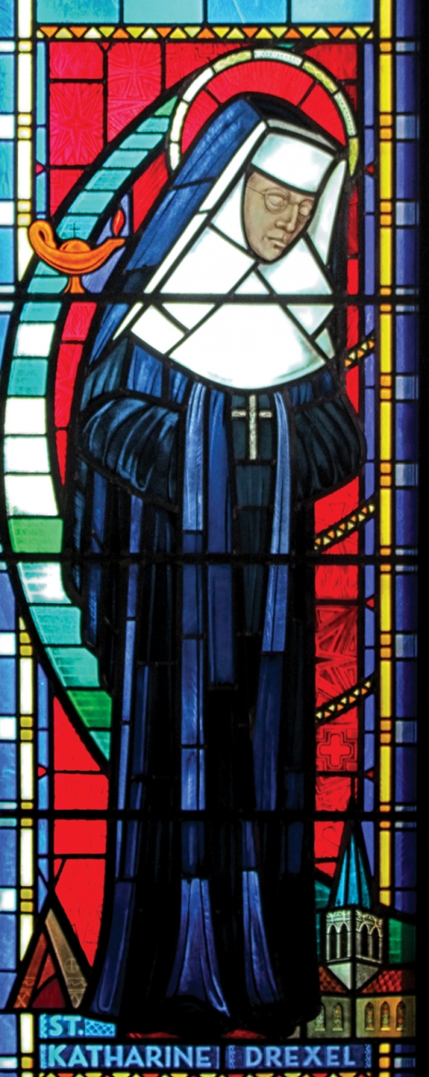 Memorialized in the chapel’s windows are two of the first American women to be canonized: St. Katharine Drexel – a Philadelphia heiress-turned-nun who dedicated her life and fortune to the welfare of Native Americans and African-Americans, founding the Sisters of the Blessed Sacrament and underwriting schools and missions in Indian Territory – and Kateri Tekakwitha, daughter of an Algonquin mother and Mohawk father who, in 2012, became the first American Indian to be elevated to sainthood in the Roman Catholic Church.