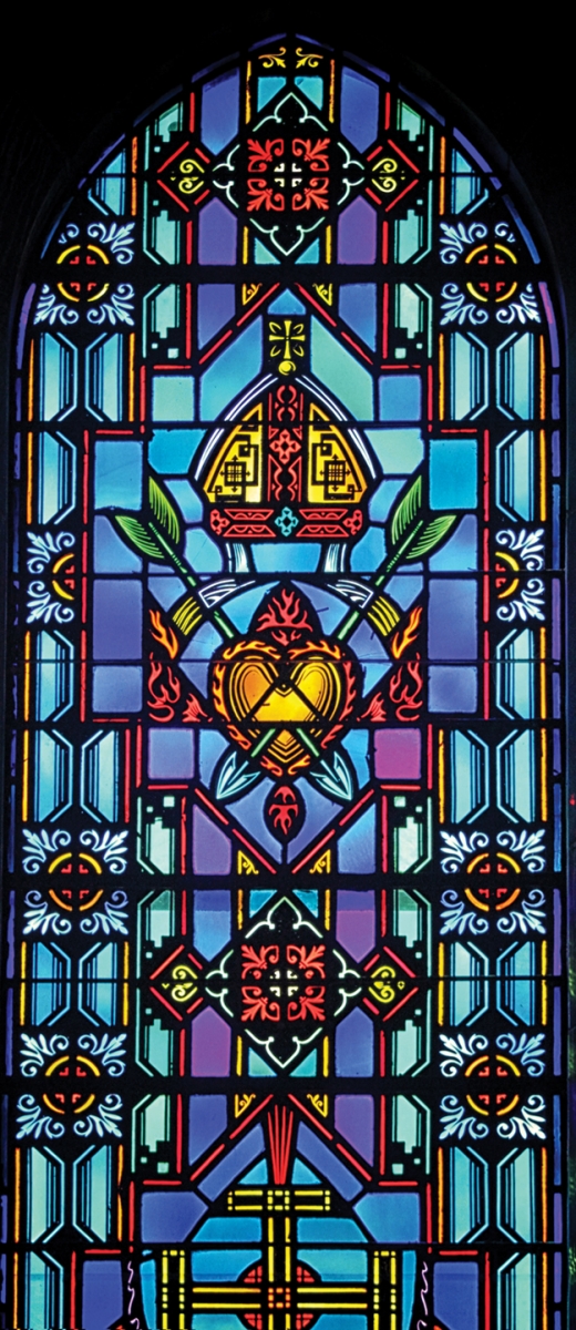 features medieval iconography of the saints, created using traditional techniques by the Milwaukee-based T.C. Esser Company.