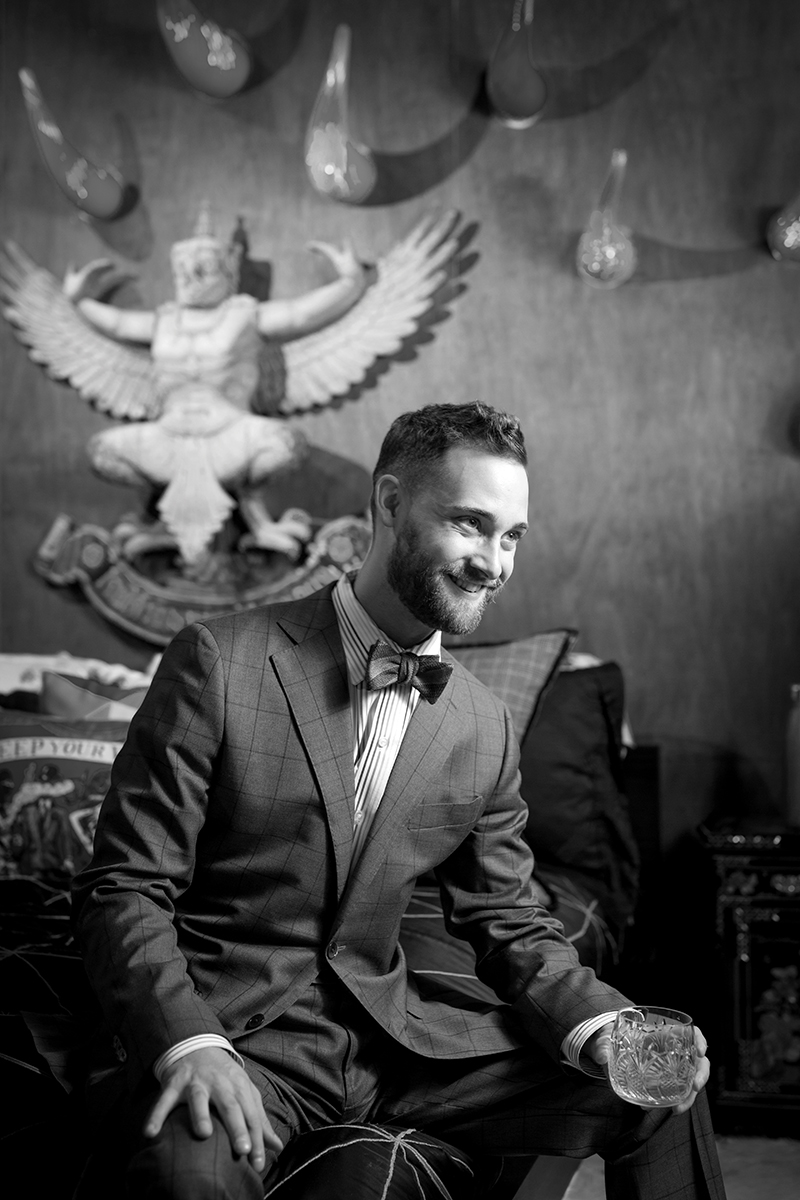 Kris has a drink while getting ready; he’s wearing a suit and bow tie from Hans Herman Tailors.