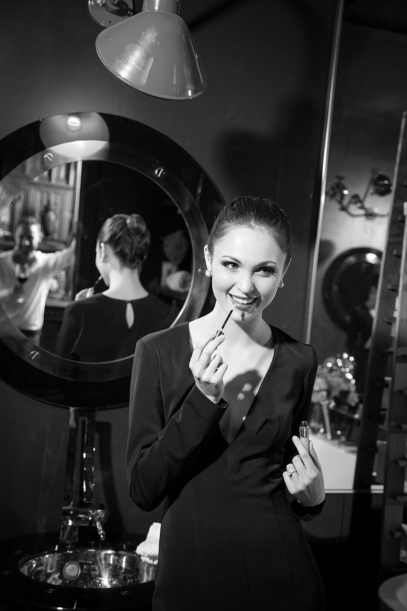 Jessi touches up her makeup; her black custom dress is by Stella Thomas Designs.