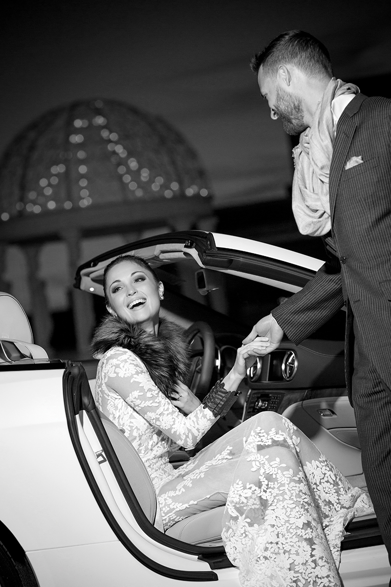 The sun sets on a thoroughly enchanting evening. Jessi’s dress and fox collar are by CORSO and her horn bracelet is by Stella Thomas Designs; Kris is wearing a custom suit from Hans Herman Tailors and scarf by Ermenegildo Zegna.