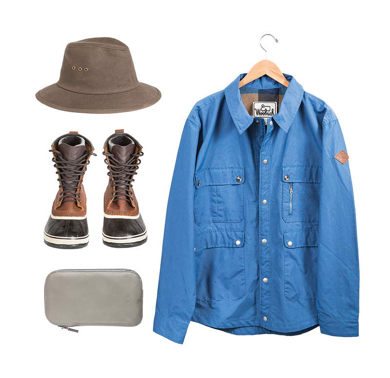 (clockwise from right) Woolrich waxed heritage jacket from Blue Seven, $169.97 // Bellroy Elements weatherproof wallet from Blue Seven, $89.97 // Sorel 1964 men’s waterproof boots from Blue Seven, $149.97 // Weatherproof Yellow 108 Helm hat from Blue Seven, $49.97