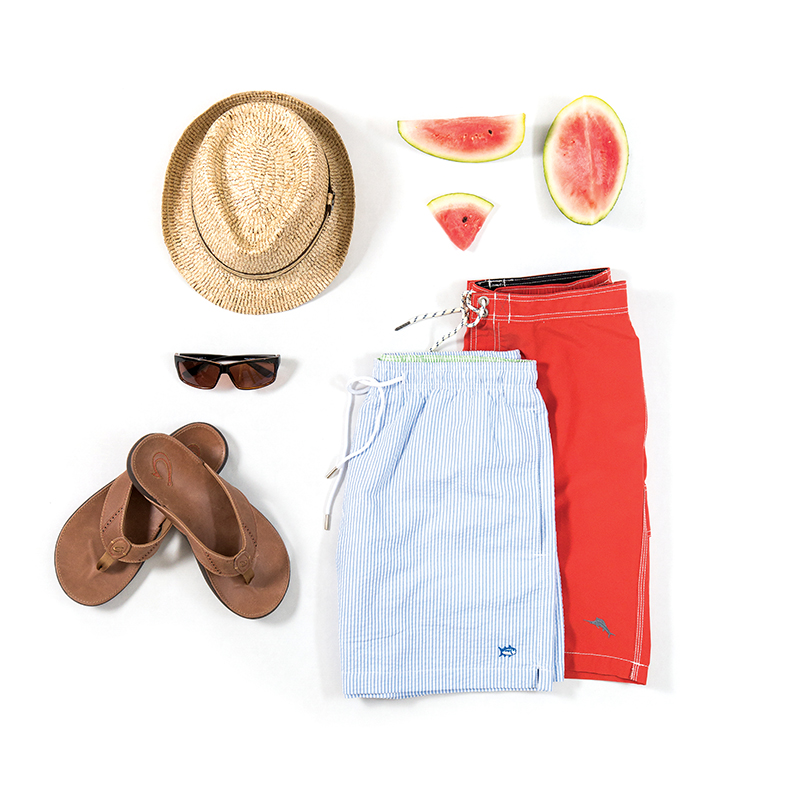 Tommy Bahama hat ($45), OluKai men’s flip flops ($80), Tommy Bahama red Baja Poolside swim trunks ($78) from Von Maur, OKC // Costa sunglasses ($149), Southern Tide seersucker swim trunks ($85), Kiel James Patrick rope bracelet ($40) from Threads, Norman