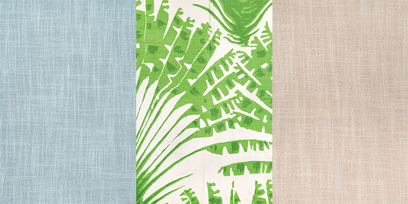 (left) Dusty Blue linen, $25 per yard from West Elm | (middle) Palma in green by Christopher Farr Cloth, $220 per yard from Ketch Design Centre | (right) Natural linen, $25 per yard from West elm