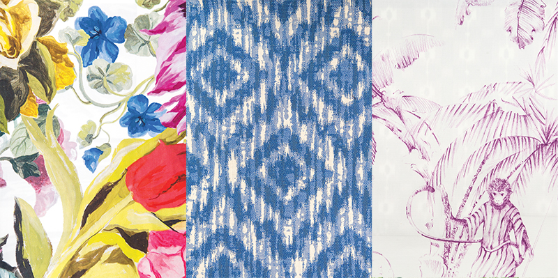 (left) Orangerie – Rose by Designers Guild, $290 per yard from Ketch Design Centre | (middle) Orissa Diamond Blue by Sunbrella, $53.90 per yard from Fabric Factory, OKC | (right) Barbary Toile in amethyst by Nina Campbell, $184 per yard from Ketch Design Centre