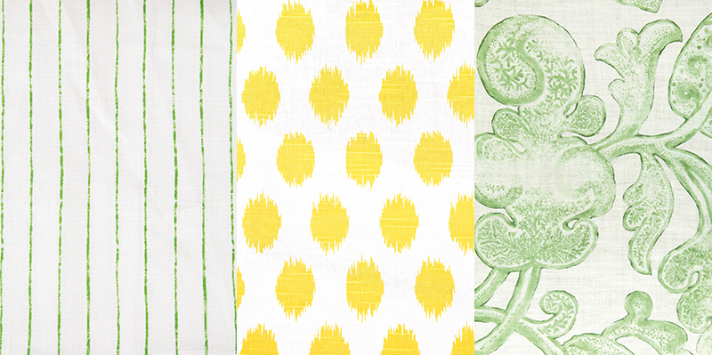 (left) Broken Stripe in green by Christopher Farr Cloth, $170 per yard from Ketch Design Centre | (middle) Jo Jo Corn Yellow Slub, $15.90 per yard from Fabric Factory, OKC | (right) Lysander in ivy, $61.90 per yard rom Fabric Factory, OKC