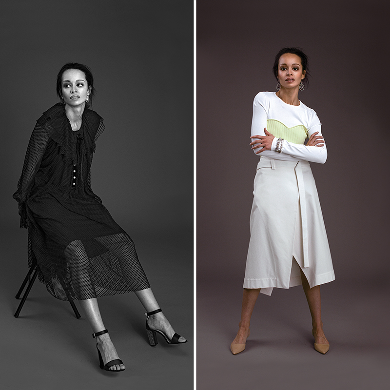 (right) Cedric Charlier ivory and yellow knit sweater and ivory cotton skirt, both from the Consortium. Simon Sebbag freshwater pearl and quartz bracelets and Brighton pink Swarovski crystal teardrop earrings from Nancy Farha. Butter “Dollie” patent d’orsay kitten heel from Betsy King Shoes.