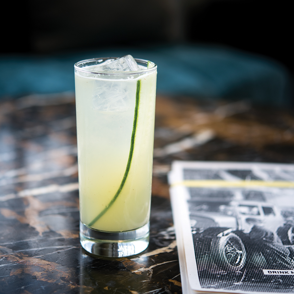 The Laid Back starts with Hendrick’s gin, the botanicals of which are cucumber and rose petals, and then O’Hara explains the rest of the process like so: “We juice cucumbers, and reduce that cucumber juice down with ground pink peppercorns and sugar to make a vegetal, aromatic, floral syrup with a touch of spice. We top that off with sliced cucumber and lemon juices and a touch of soda, and the finished product is a fresh and tasty cucumber cooler that’s perfect for the summer.”