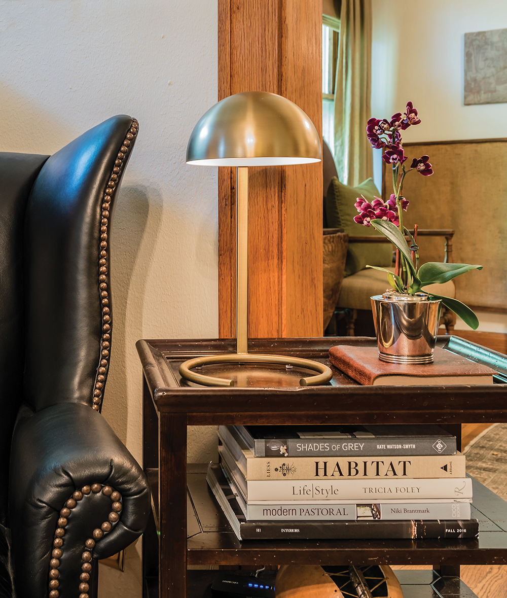 Mixing textures is one of Billingsley’s fortes, seen here in the brass studs, soft leather and a contemporary brushed-brass lamp, leather-bound antique book and orchid atop a vintage side table. A non-stop editor of home décor, Billingsley regularly haunts Embellishments in Tulsa; in Oklahoma City he checks in at Sabi, Antique Avenue, Interior Gilt and The Rink; and farther north in Kansas City, he heads for Sid and Company, Parrin & Co. Antiques and George Terbovich Design.