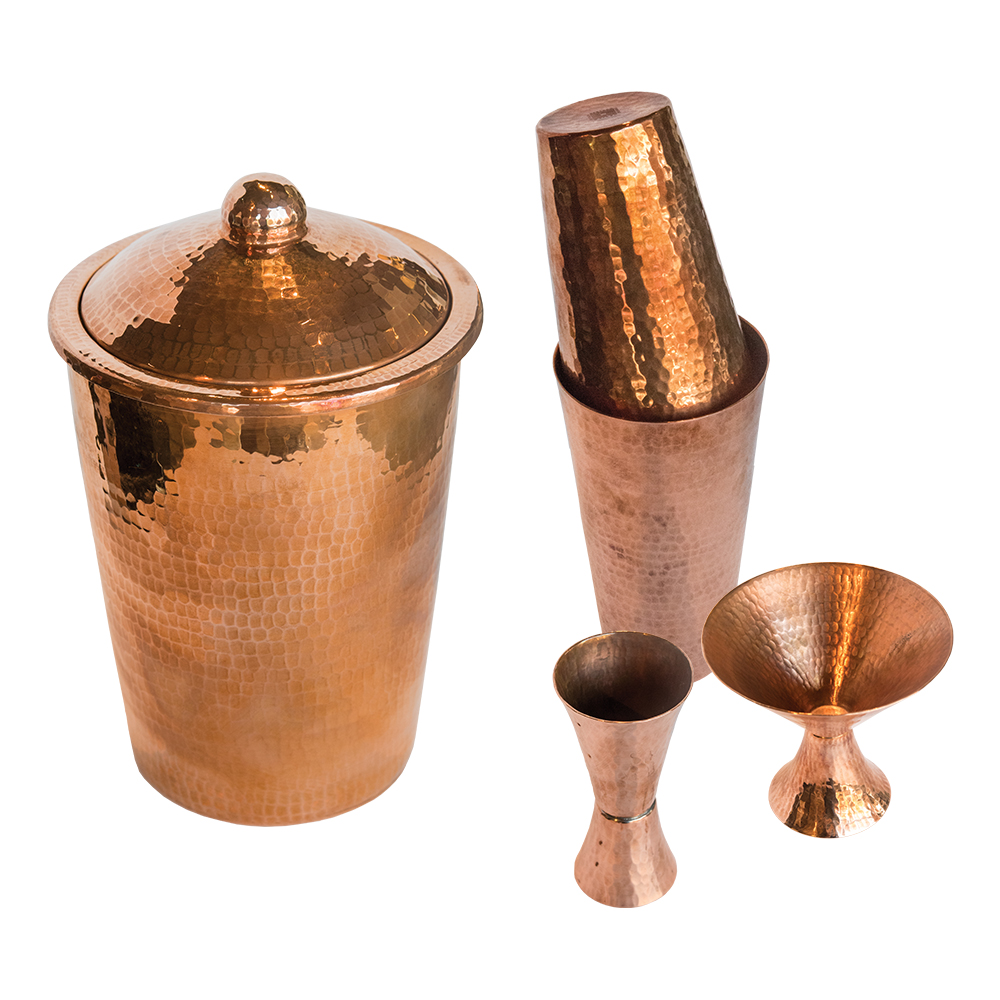 Ice bucket, $119; jigger, $24.99; martini glasses, $33; shaker set, $94.99 from Urbane