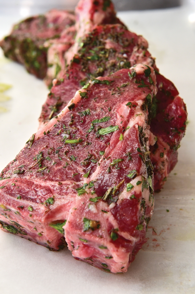 When braising muscle cuts or shanks, she prefers chopped fresh rosemary and Dijon. She often adds mustard seed too, and pistachios or hazelnuts pair well for a crust. Chops are really very easy to work with, and Aust said to grill the chops to medium rare (an internal temperature of 120 degrees).