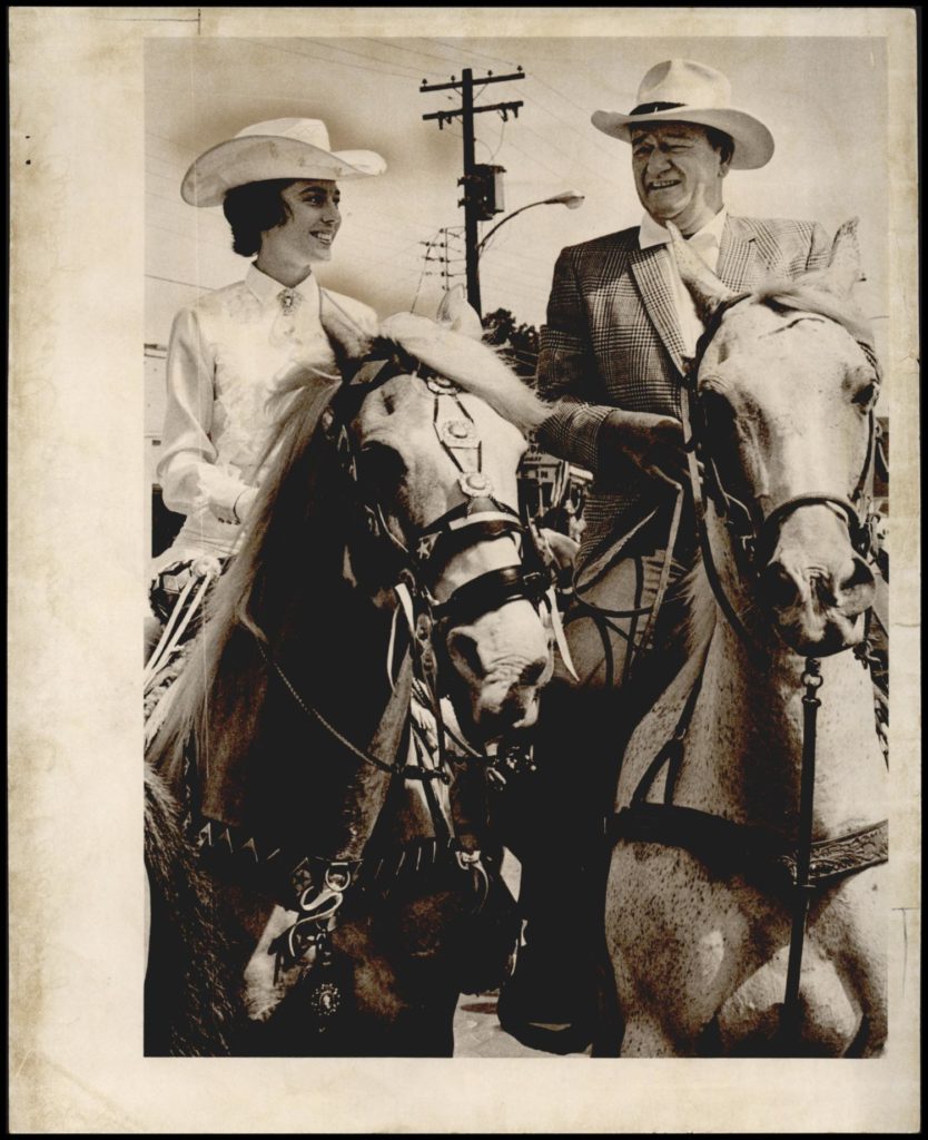 Courtesy of Oklahoma Historical Society. Actor John Wayne and parade queen Neva Butler at the opening of the National Cowboy Hall of Fame and Western Heritage Center in 1965.