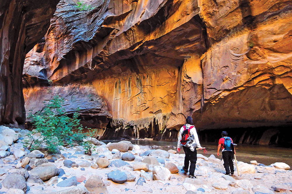 Sometimes adventures call for us to climb – and other times, adventurers must simply push through. No place in Zion is this more evident than in the famed Zion Narrows, where a one-mile trail leads to the entrance of the rushing Virgin River. Over centuries, water has carved perfectly sculpted rock walls, and it is through these beautifully sculpted walls we walk. Kind of. As the National Park Service website states, “It is not, however, a trip to be underestimated.” This is because approximately 60 percent of the hike in the Virgin River involves wading, walking through water – and sometimes swimming. There is no trail, and the current is swift with slippery rocks underfoot. During heavy rains, areas of the Narrows will flood, which can be dangerous in certain spots where there are no large boulders to climb and wait it out. Sound adventurous? It is. – MP