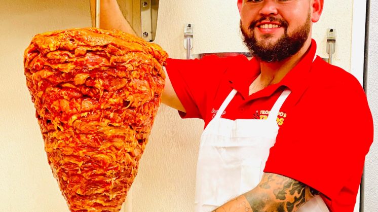 “My girlfriend and I went to Playa del Carmen in 2019, and we ate tacos al pastor every day,” he said. “I became fascinated with the Lebanese culture behind al pastor, and the food was delicious.” He also loved that the al pastor in Mexico was carved from the trompo, a vertical, rotating spit based on the design of a children’s toy: the top, or trompo in Spanish. Meat is layered onto the spit, often with onions at the base and a pineapple at the top. The meat roasts on the rotating spit, and then is carved outside-in to make tacos, mulitas, tortas, or whatever else the taqueria offers. Traditional al pastor is pork, a change made from the Lebanese spit-roasted lamb when immigrants settled in Mexico.