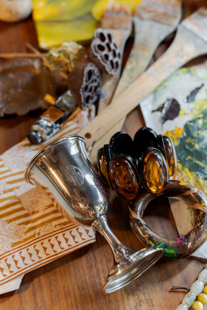 Costume jewelry strewn throughout presents a variety of interesting and smooth materials: amber bakelite, horn, jade and coconut shells. The burlwood bowls are beautiful and earthy. A Native American figurehead, centered on a bronze ashtray, hints at that first Thanksgiving table. The antique copperware dates back to 1880, sourced from England. Meanwhile, the Frankoma Pottery was sourced a little closer to home: Frankoma Pottery is a beloved homegrown company, founded in 1933 by artist John Frank in Norman, Oklahoma.
