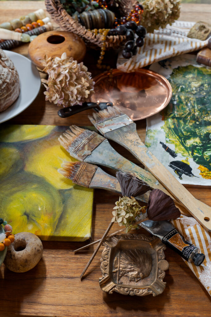 The paint brushes and apple painting are Hammack’s own, as well as the big greenish-yellow brush strokes captured on paper. (This photoshoot was set up just steps away from her art studio.) The rustic sourdough loaf—as well as Hammack’s painting—celebrate the cooking, baking and “breaking bread” together which tend to define this time of year. Imagine a traditional apple pie or freshly kneaded loaf baking inside a warm oven; the smells permeating the air make the kitchen extra cozy on a crisp autumn day. Dried hydrangeas from Pierce’s garden remind us of seasonal changes happening all around us outdoors: the cascading colors of fall foliage and the movement of falling leaves in the breeze.