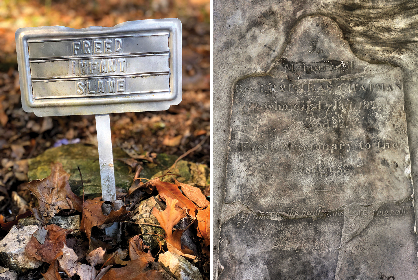 The first Oklahoma cemetery with evidence of Christian-style burials is Union Mission, established in 1820 in hopes of converting the Osage with education and evangelizations. Its first burials were recorded in 1822. The gravestone of the Rev. Ephaphras Chapman, who died Jan. 7, 1825, is preserved on the old mission grounds. (NOTE: We’ll explore his story next month.)