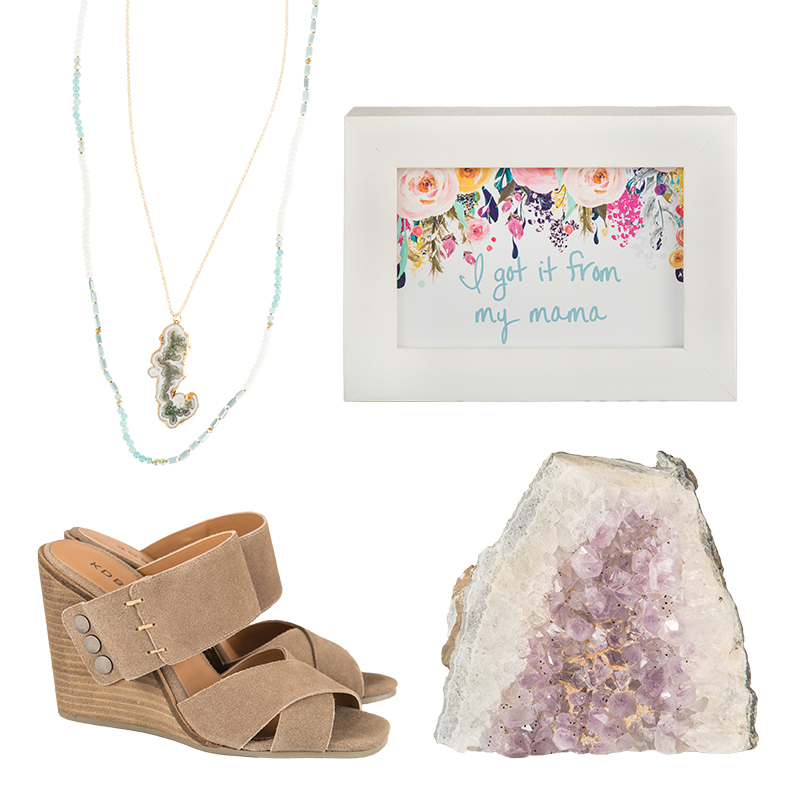 (clockwise from top left) Necklace duo, $68 Pinkerton calls this her “favorite necklace pairing in the store right now,” saying she loves “the beautiful colors of the dainty beads, and the agate is everything.” // “I got it from my mama” framed art, $36 Fite calls this magnet board, “The perfect gift for mothers! Locally made right here in Norman by Nikki Harrington.” // Amethyst geode, $48 “We’re carrying more raw elements of nature, like chunks of amethyst and selenite,” explains Pinkerton. “Gorgeous on a coffee table or used as bookends.” // Kelsi Dagger Brooklyn suede wedges, $135 “These taupe wedges are one of our best sellers,” says Fite. “They are comfortable to wear and are totally versatile.” Pinkerton adds that they’re “thrilled to be carrying shoes now, although [I’m] going to need a bigger closet.”