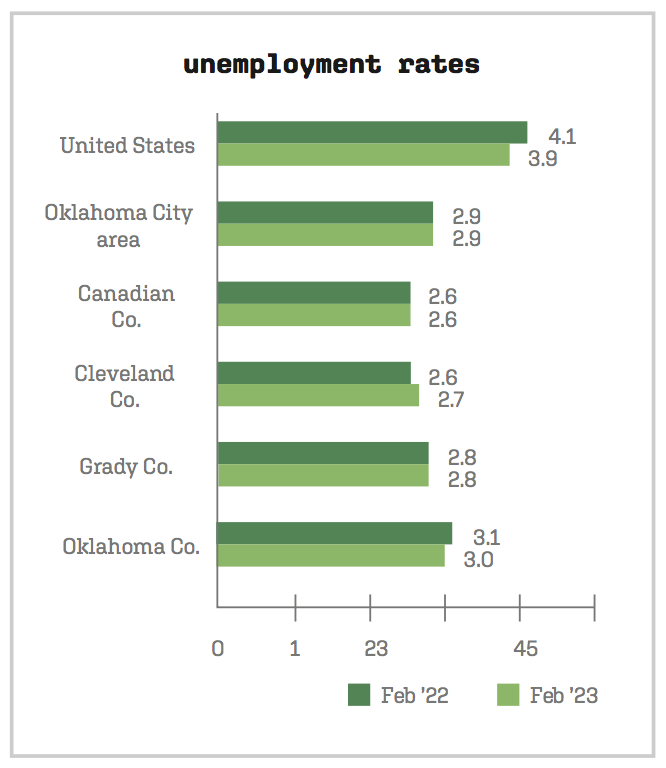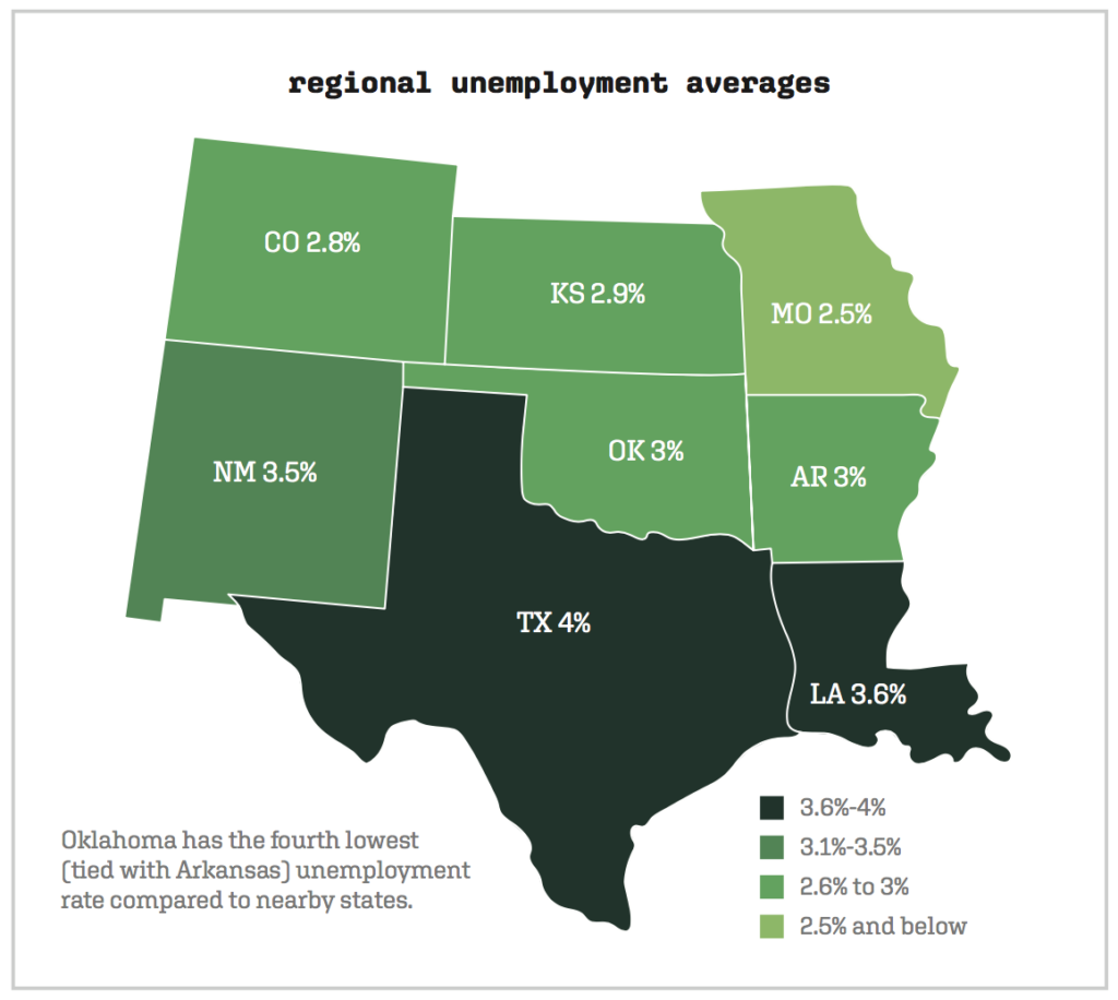 Oklahoma sits with about a 3% unemployment rate, with Oklahoma City, the counties it occupies and surrounding counties closely matching the state rate.