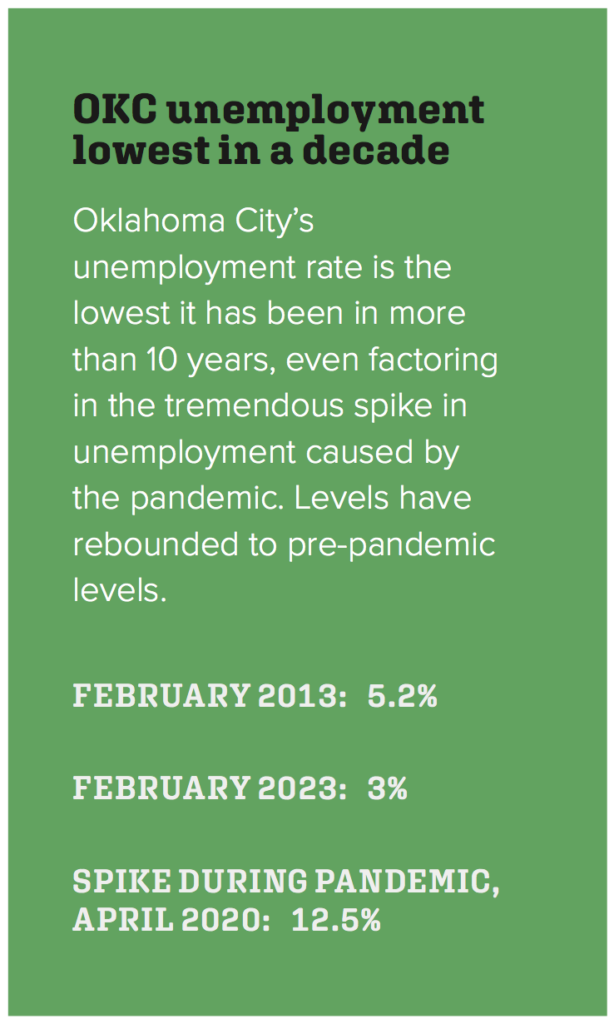 Oklahoma sits with about a 3% unemployment rate, with Oklahoma City, the counties it occupies and surrounding counties closely matching the state rate. This low unemployment rate is almost a full percentage point below the national average, and most areas — both in Oklahoma and across the nation — are seeing unemployment numbers that rose significantly during the pandemic now fall as COVID recovery continues.