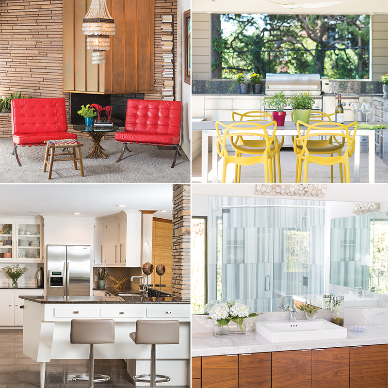 • The sitting area in the master bedroom is home to two cheery red Barcelona chairs from Mod50s Modern in Tulsa, and a Mid-century capiz-shell chandelier sourced by Cara’s father, Jack SmithSchick, owner of Architectural Antiques in Oklahoma City. The stone wall and copper fireplace are original to the house.