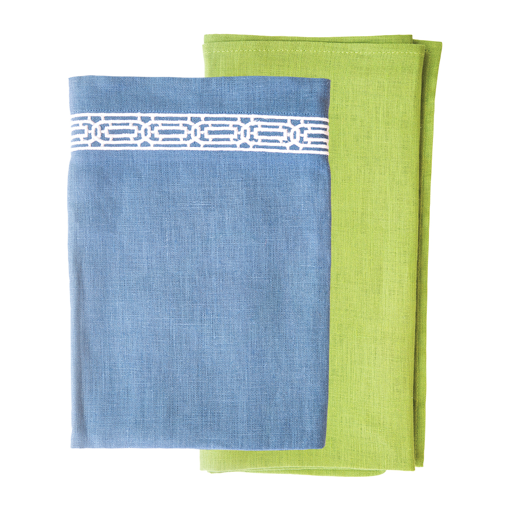 Fretwork blue napkin with white stitching, $38 // Deborah Rhodes green napkin, $31 both from Bebe’s