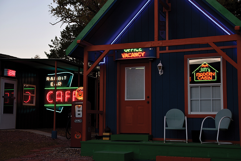 Ross’ home, which is lit by neon and accented by antique gas pumps, makes a frequent photo opportunity for visitors cruising up the historic highway. And while the gas station façade sparks curiosity, its backyard is where the home truly glows: That’s where you’ll find nine thoughtfully arranged vintage neon signs, some antique and others replicas, arrayed like a neon garden. The visual is centered on a small cabin Ross built by hand, which also is designed to look like an old-fashioned gas station.