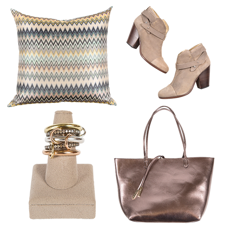 (Top left to right) Missoni pillows “The fabrics of Missoni are rich in history and are timeless.” // Harrow boot by Rag & Bone “Comfortable and easy to wear with my favorite jeans or casual dress.” // Reversible tote bag “This bag goes with me on all overnight stays. Perfect size.” // Spinelli Kilcollin Ring “I love when designers think outside the box. This ring can be worn multiple ways.”