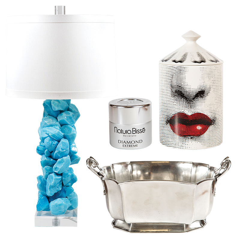 (left to right) Handmade turquoise slag glass lamp “I have a love for natural stones.” // Diamond Extreme cream by Natura Bissé “This anti-aging and firming cream, I could not do without.” // Fornasetti candles “The history and style of this artist (Italian painter and engraver Piero Fornasetti) makes these pieces collectible and work with any décor.” // Mushroom bowl by Match Pewter “Pewter is timeless and works in any décor.”