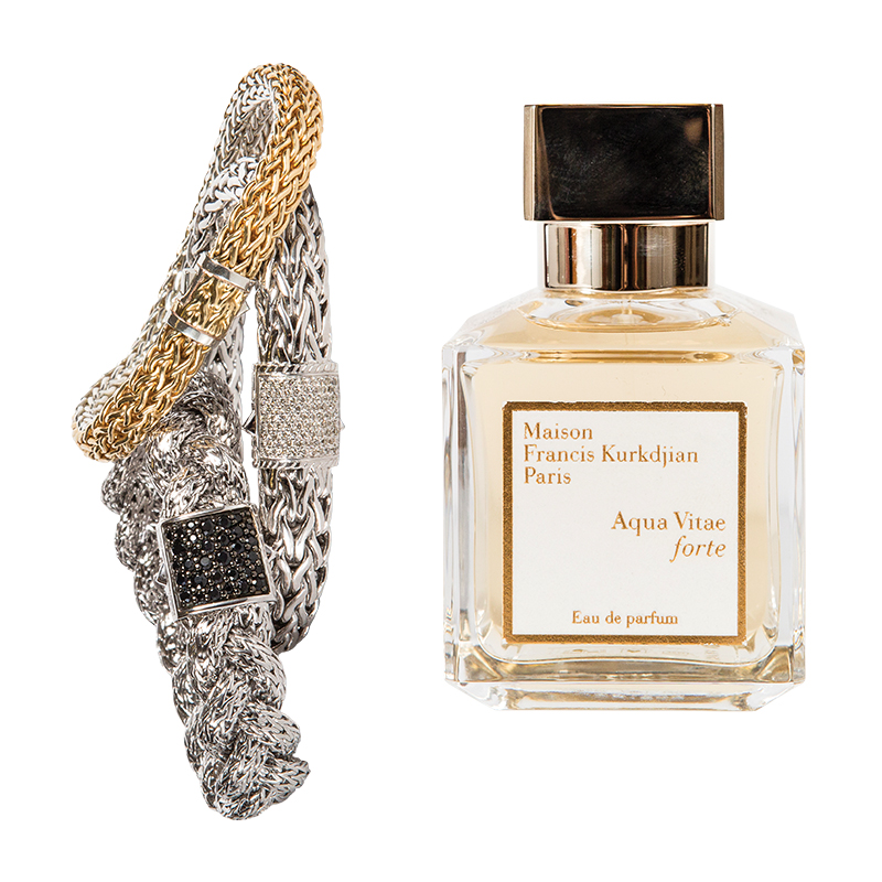(left to right) John Hardy handmade bracelets “John Hardy has been a passion of mine for 25 years. The hand-crafting of this jewelry sets it apart.” // Maison Francis Kurkdjian fragrances “It is rare to find fragrances that are this uniquely wearable.”