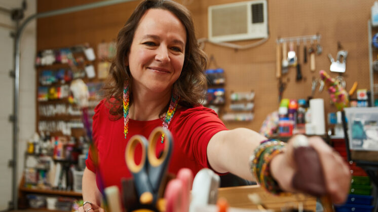 You know the Goodwill Outlet that’s on Reno Avenue? I love to go down there and just grab handfuls of little bitty plastic bits. At regular thrift stores, I will go and I’ll find jewelry, I’ll deconstruct it and I’ll use the beads.