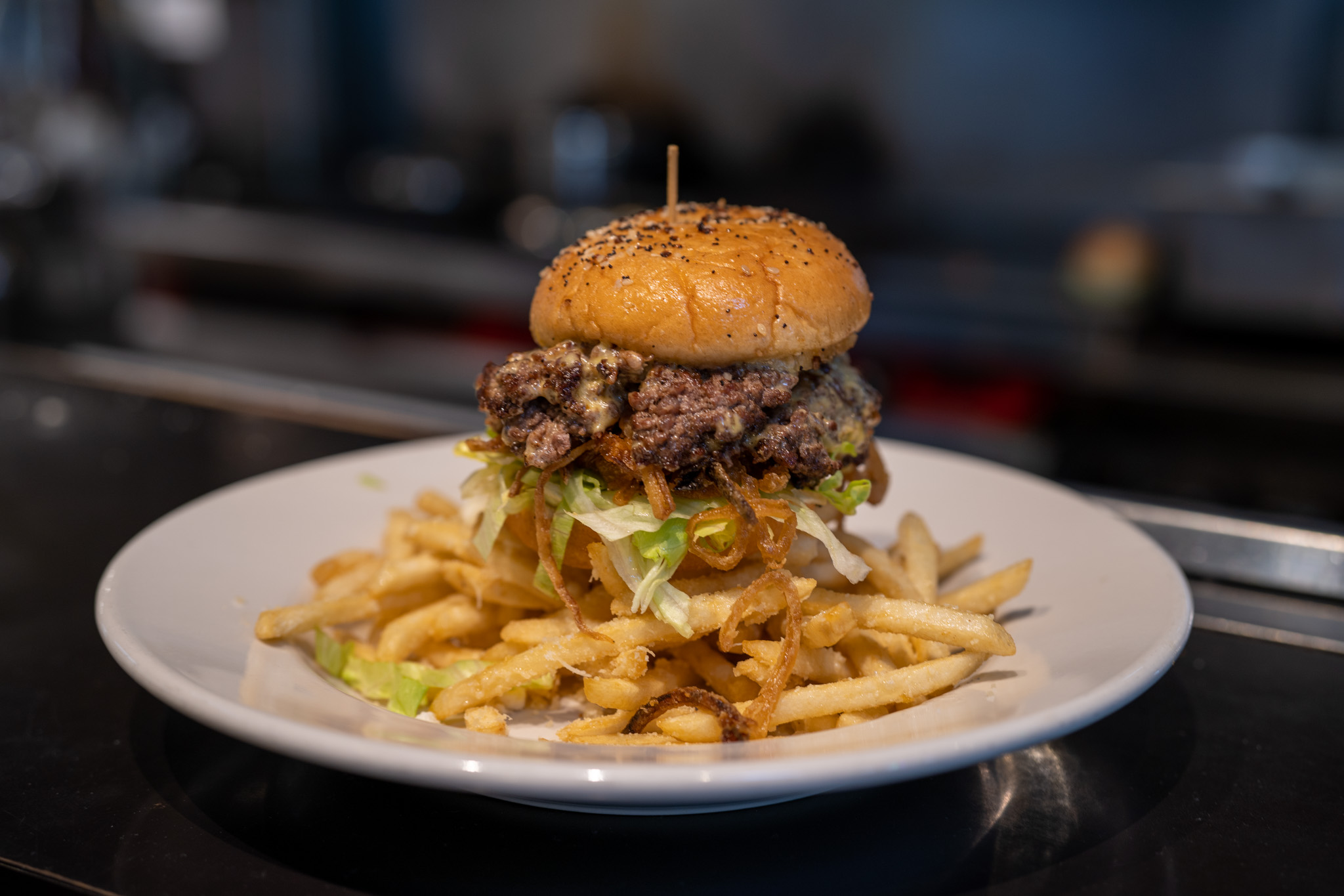 He also took inspiration from two of his other favorites: Smashburger and In-N-Out Burger. So take a Big Mac, a Double Double and a smash burger, and then nerd it up — that was the formula, and he’s a problem solver who would make an excellent engineer. Two beef patties, one smaller than the other so they cook properly when stacked, Kraft American cheese because it melts like a blanket of gooey deliciousness, fried onions, a sauce he created that he says Raising Cane’s would use if it opened a burger joint — heavy on Worcestershire and red wine vinegar — iceberg lettuce because it stacks right, and then a bun that is always brioche on the bottom because it holds up.