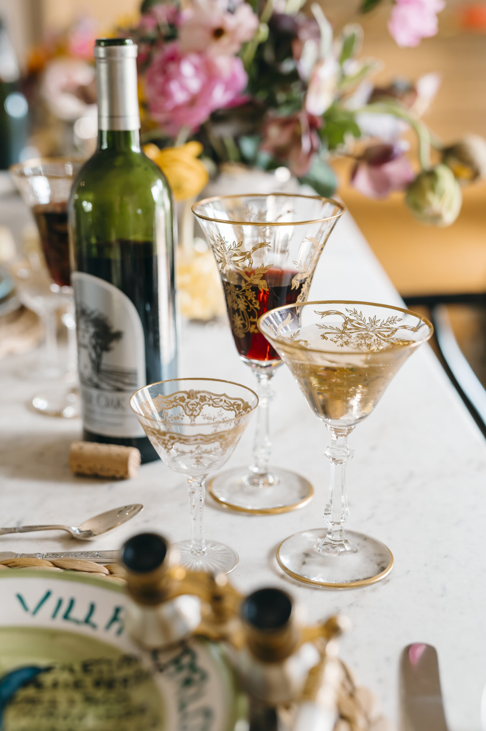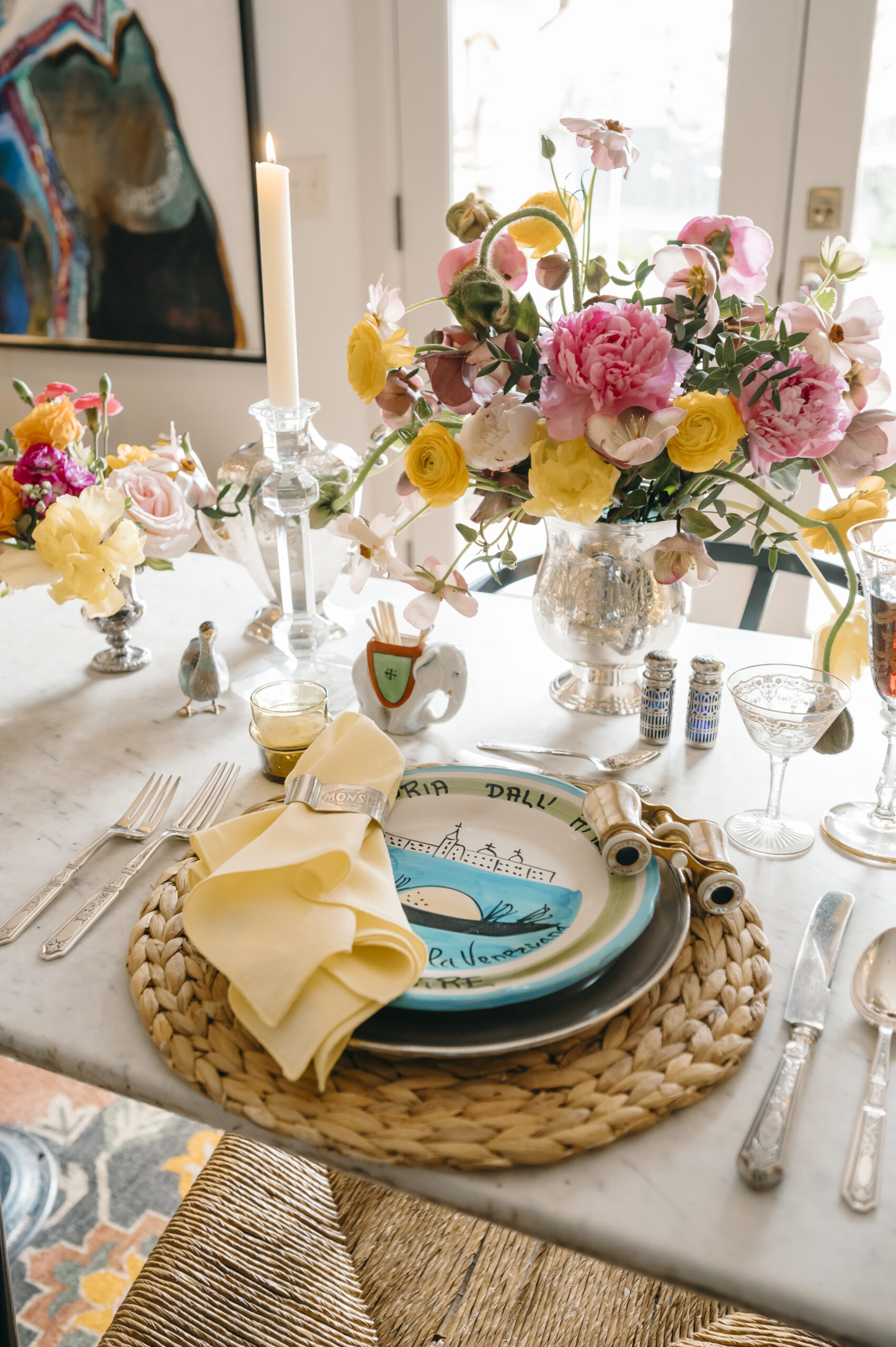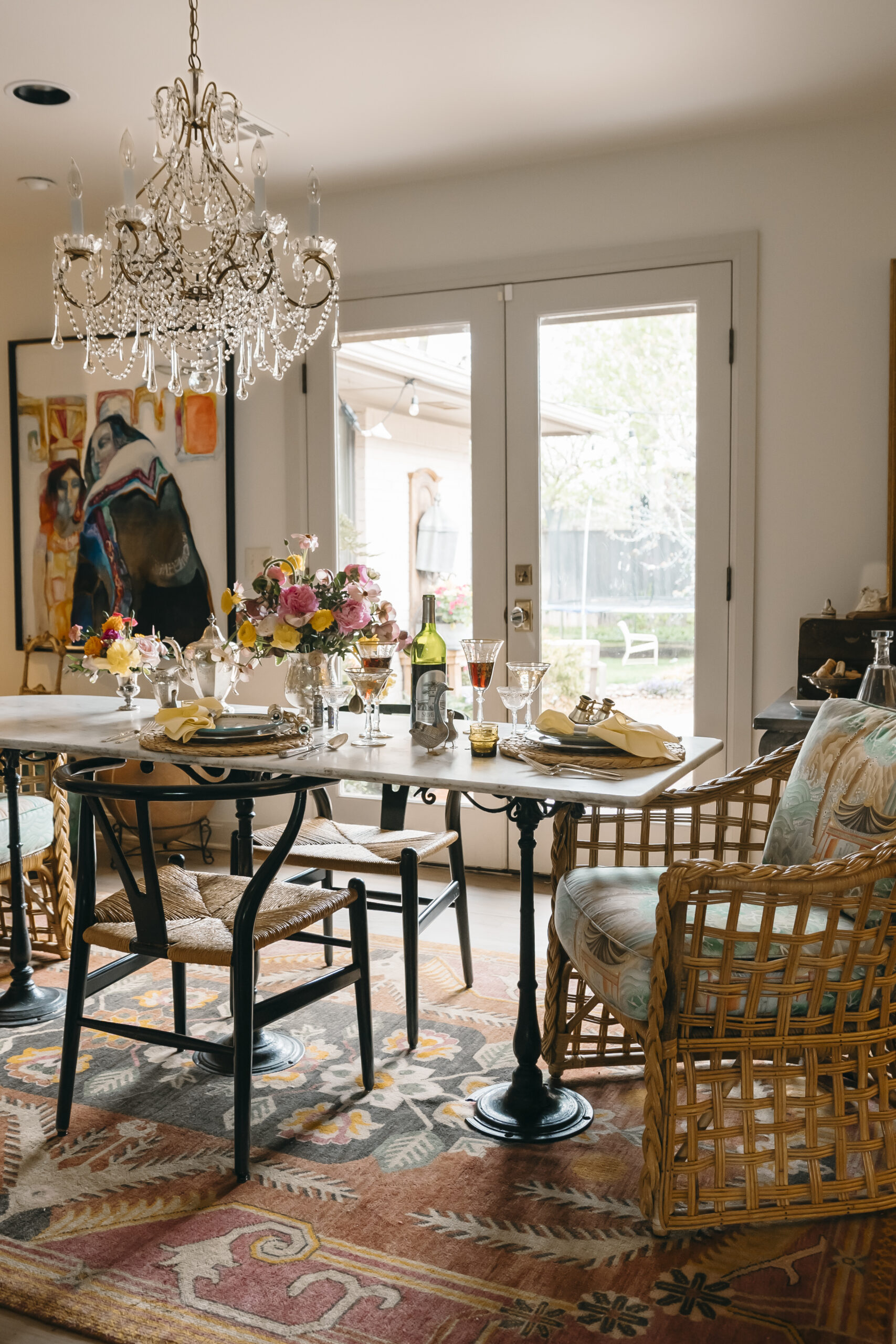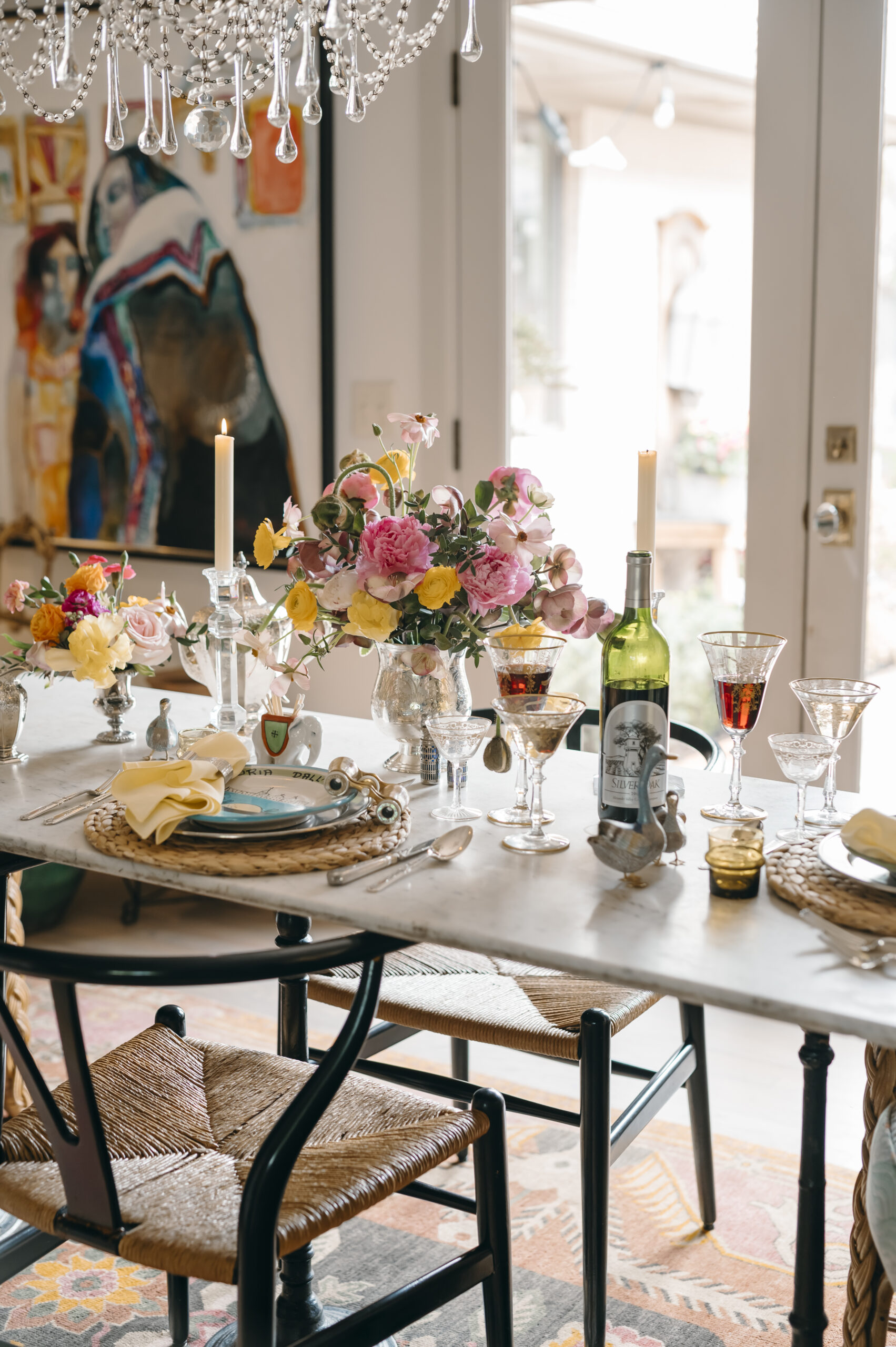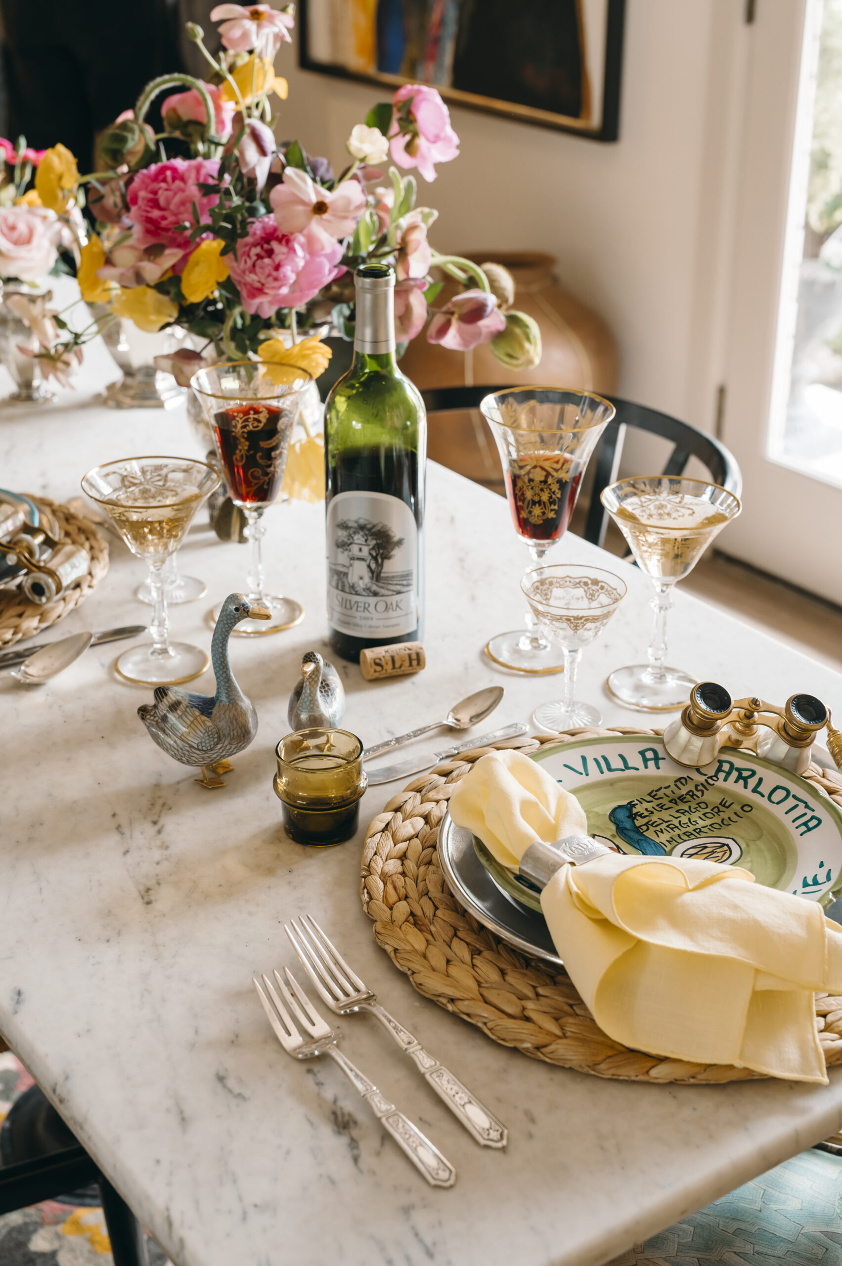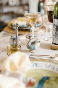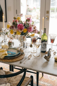 Interior designer Anna Covington sets a festive summer table with global collectibles and family heirlooms. Scandinavian chairs by Hans Wegner and Palm Beach Regency-style wicker chairs with Schumacher cushions await guests. Hand-painted ceramic Italian restaurant plates layer perfectly with MATCH Pewter chargers, French napkin rings and English vintage napkins. Covington’s family heirlooms — all from England — include the flatware, golden-detailed glasses and a silver tea set. Covington has a passion for floral design, as reflected in her eye-catching arrangement of peonies, ranunculus, poppies and lenten roses. She also adores quality rugs; this dining room features a hand-tied Indian wool rug sourced from Tabriz. The French chandelier and bistro table come from her mother’s store, Covington Antique Market, which served collectors well on Western Avenue for 20 years. Much like the upcoming Olympics, this setting celebrates a time and place where countries converge. Mexican shot glasses, French Moet Champagne and American Silver Oak cabernet sauvignon inspire a toast: To the world’s best … let the games begin.