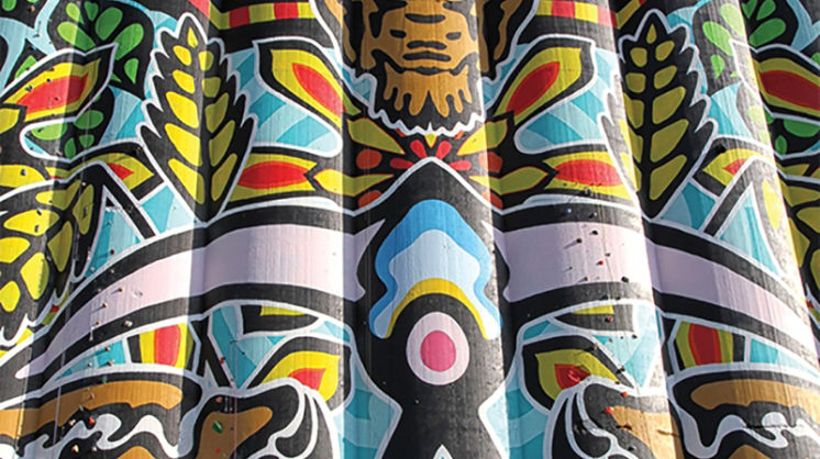 Unveiled on May 30, the 130-foot-long, twelve-and-a-half-foot-high spray-paint mural in Oklahoma City’s Automobile Alley weaves together the geometric and celestial-inspired designs of Kris Kanaly; a lush, undulating plant that snakes from blue to orange to green to violet, created by Yatika Starr Fields; and Dylan Bradway’s be-hatted magician with sinewy arms extended to either side, gesturing toward the skull of his trick rabbit, whose ears flow back to complete the braid. A joint statement from the artists notes the work celebrates “imagination and the connectivity through collaboration” and serves as “a powerful public exhibition of how different cultures, ideas and imaginations can be woven together for a stronger creative bond.”