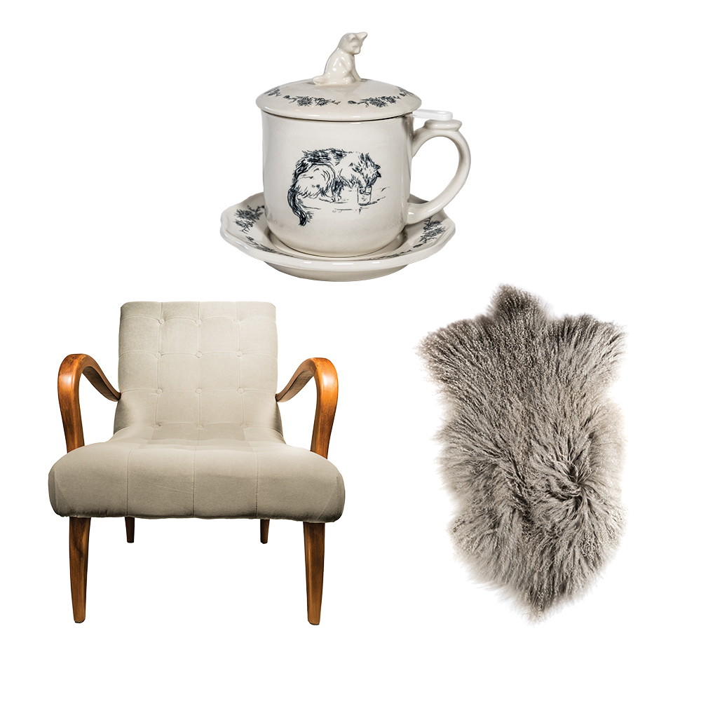 Modern blue and white ginger jar, $44 “I love blue and white ginger jars and vases because they’re classic and never go out of style.” // Mongolian lamb fur throw, $75 “I’m obsessed with the Mongolian lamb fur throw because it adds texture to anything … literally anything!” // Aidan Gray mid-century modern chair, $495 “The lines are simple and it’s so chic.”